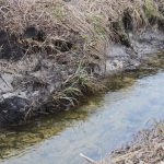 Wieder ein paar Meter östlich findet sich ein weiterer, offenbar viel älterer Biber-Damm von eher typischem Aussehen. An seinem Überlauf sind am wiesenseitigen Ufer tiefe Mulden ausgespült. Eine vor langem angenagte Birke liegt da, vom Wind gefällt, die Nagestellen verwittert. Ein grellfarbenes Drainagerohr in einer der Mulden deutet auf einen Versuch des Bauern hin, dieses Stück Land wieder trockenzulegen. Bislang ohne erkennbaren Erfolg.
